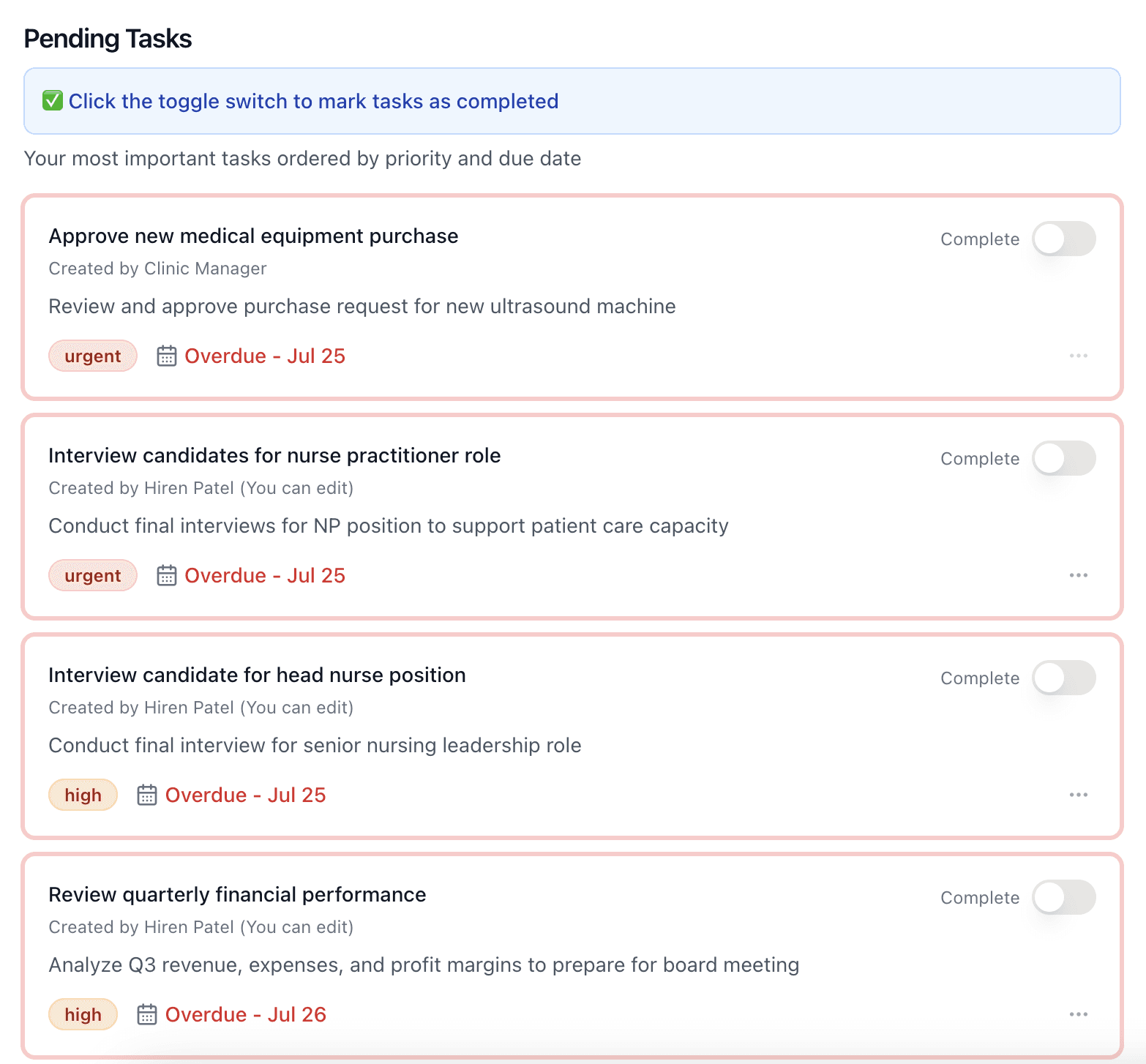 Real-time task analytics and role-based workflows — built for urgent care, dental, walk-in, and physio clinics.